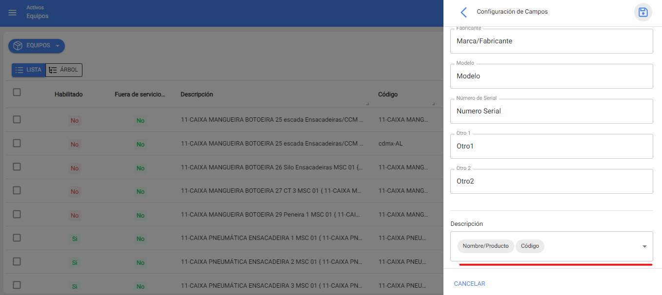 donde se abrirá una ventana para que puedas modificar el nombre de algunas columnas y en la parte final encontraras el campo para que puedas agregar o eliminar las columnas que deseas definan al activo