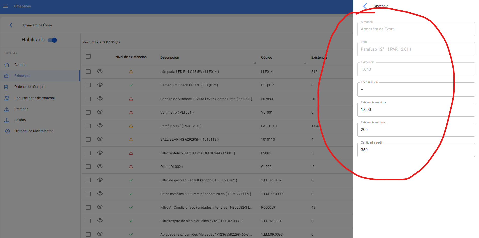 Por el momento, en el stock de cada artículo dentro de un almacén solo tenemos los campos de existencia máxima, existencia mínima y cantidad a pedir.