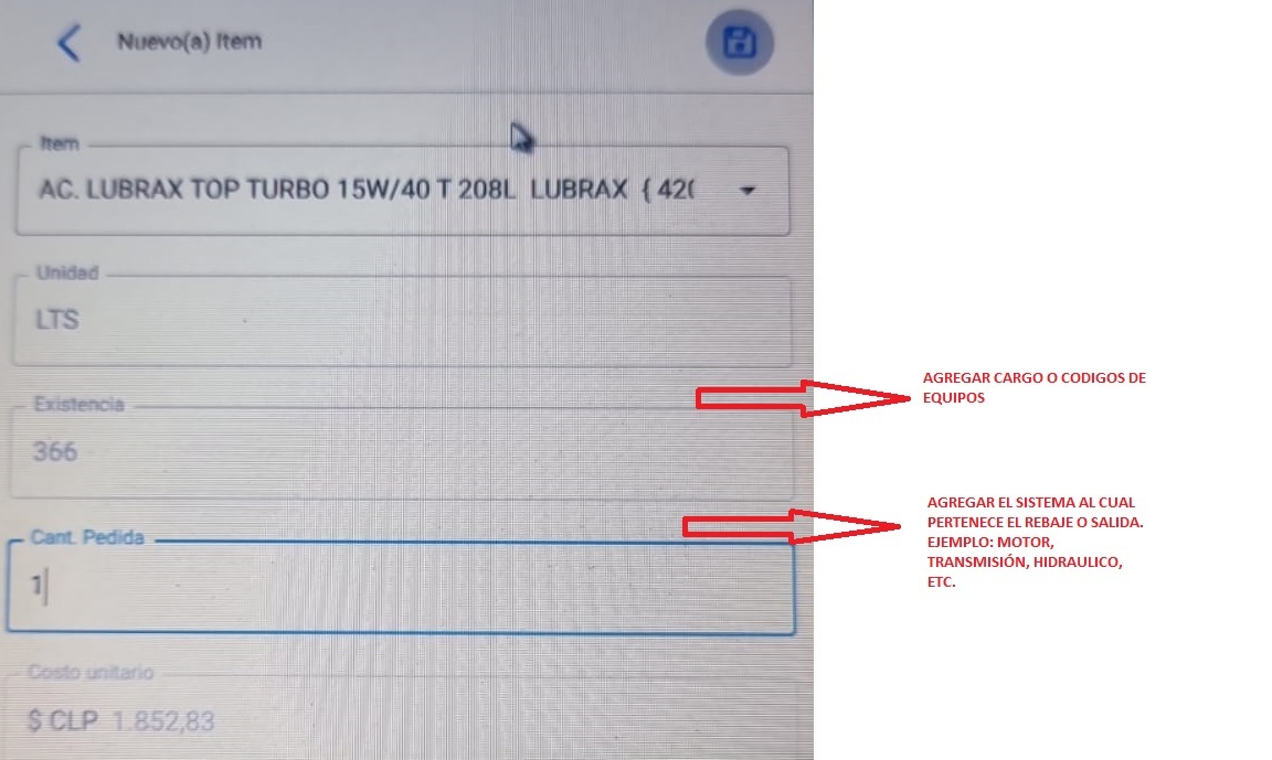 En el apartado nuevo item agregar ademas del aceite a seleccionar agregar el código del equipo y el tipo de sistema en la cual se realiza la salida de material. se indica en archivo adjunto.