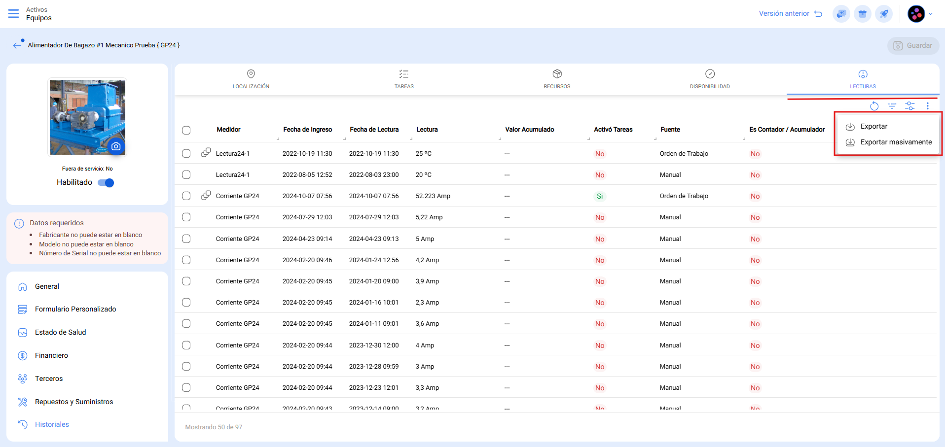 Cordial saludo Bastian. Te contamos que en Fracttal One hemos implementado esta sugerencia, donde ahora en el historial del activo se puede consultar el historial de todos los medidores vinculados a dicho activo. Permitiendo su filtrado por tipo de medidor y poder exportar la información, como se observa en la siguiente figura:
