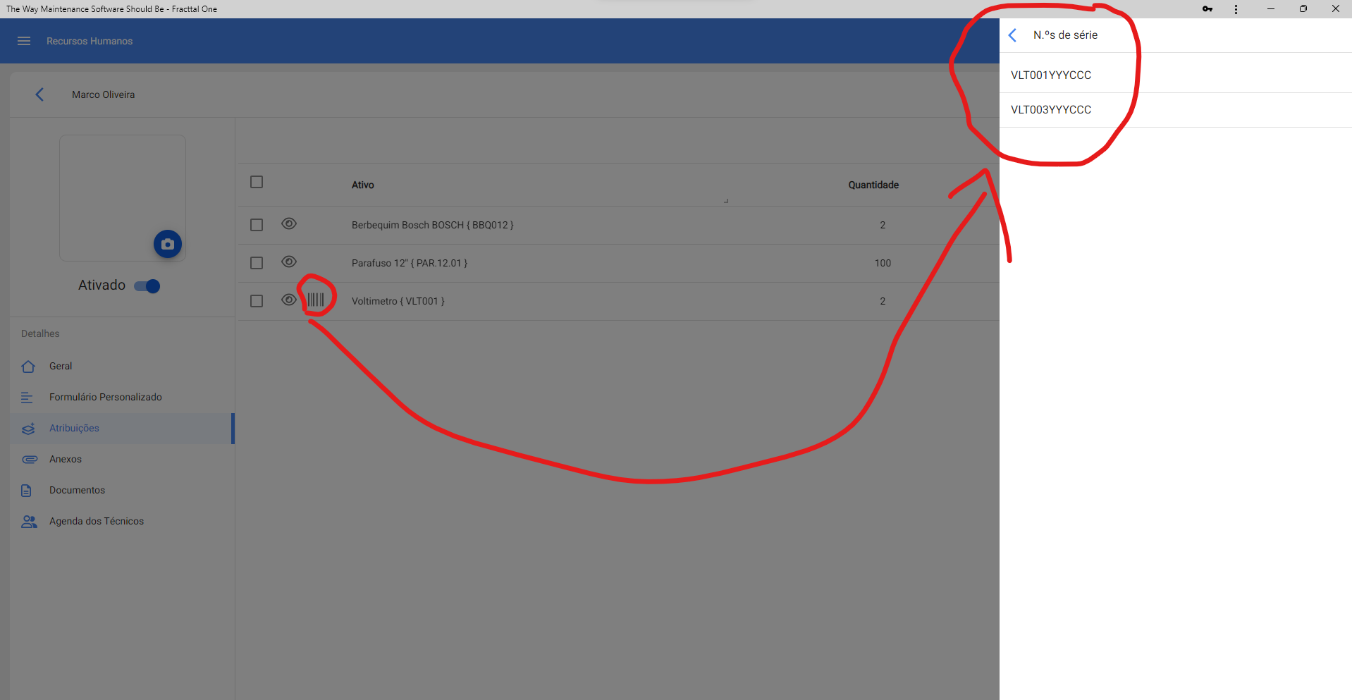 En el Módulo Catálogos/Recursos Humanos/Asignaciones, es posible consultar el número de serie de los repuestos o herramientas asignadas a este recurso humano, mediante el botón de código de barras, como se puede observar en la imagen adjunta.