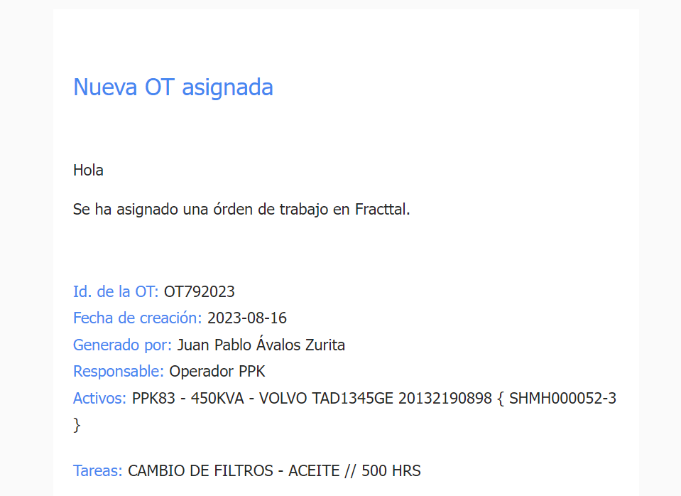 Se podría configurar la información que contiene el correo automatico generado al asignar una nueva OT, por ejemplo indicar ubicación del activo, medidor del activo, entre otros.