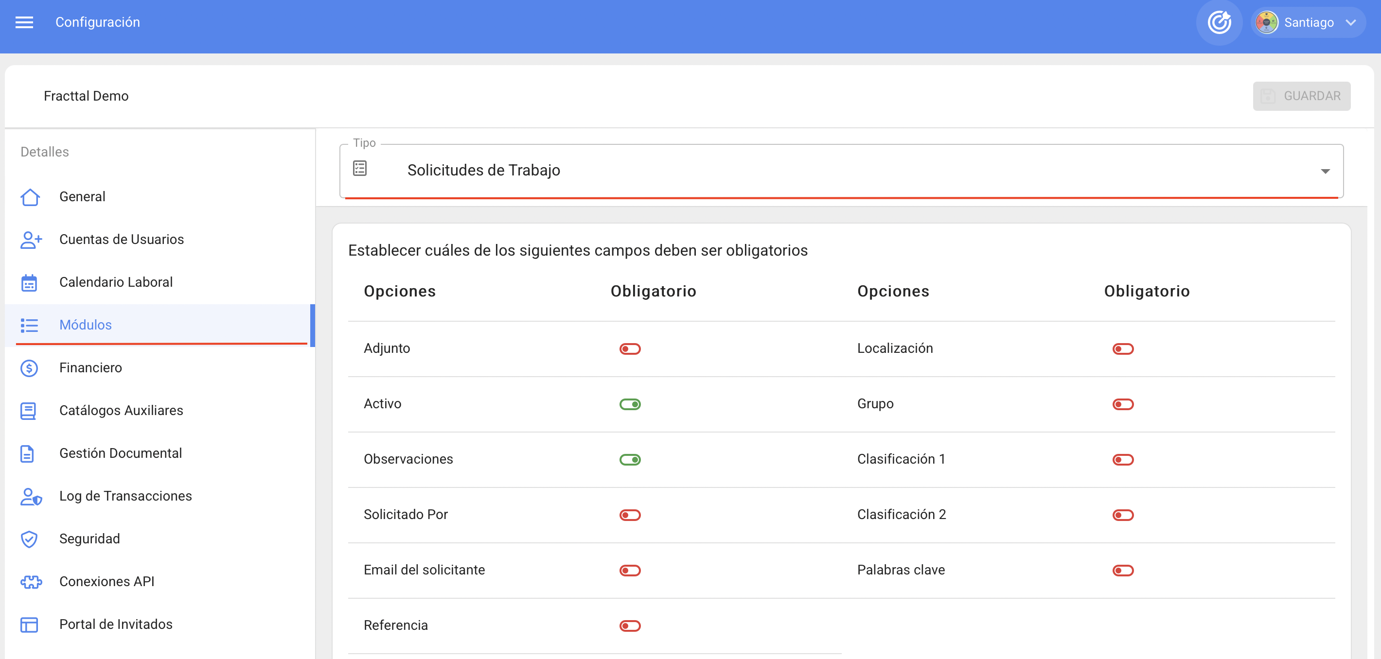 Cordial saludo Cesar, te contamos que en Fracttal One hemos implementado esta nueva funcionalidad, ahora podras configurar los campos que deben ser obligatorios al momento de realizar una solicitud de trabajo; esto permitirá que según las necesidades se defina que campos de los que se tienen disponibles al momento de crear una solicitud deben ser diligenciado por cada uno de los solicitantes, esta configuración se encuentra disponible en el módulo Configuración> submódulo Módulos> apartado Solicitudes de trabajo