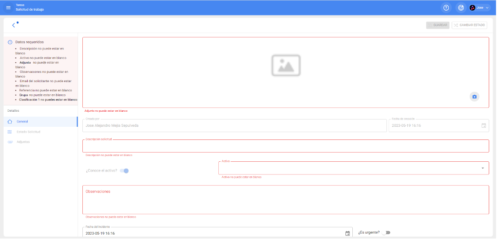 Una vez se hayan establecido los campos que serán obligatorios, cuando un usuario ingrese a realizar una solicitud de trabajo se le enmarcaran los campos obligatorios a diligenciar y hasta que estos estén con valores no se permitirá generar la solicitud de trabajo .