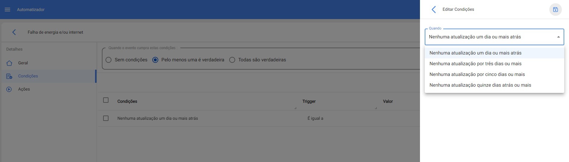 Por el momento en el módulo Automator, submódulo Eventos, en el evento "Medidor sin Actualizacción" solo es posible configurar el número de días sin actualizar un medidor, debería ser posible configurar el número de minutos en los que el medidor está sin actualizacción, por ejemplo, "Sin actualizar cada ____ minutos" y seleccione la cantidad de minutos de retraso.