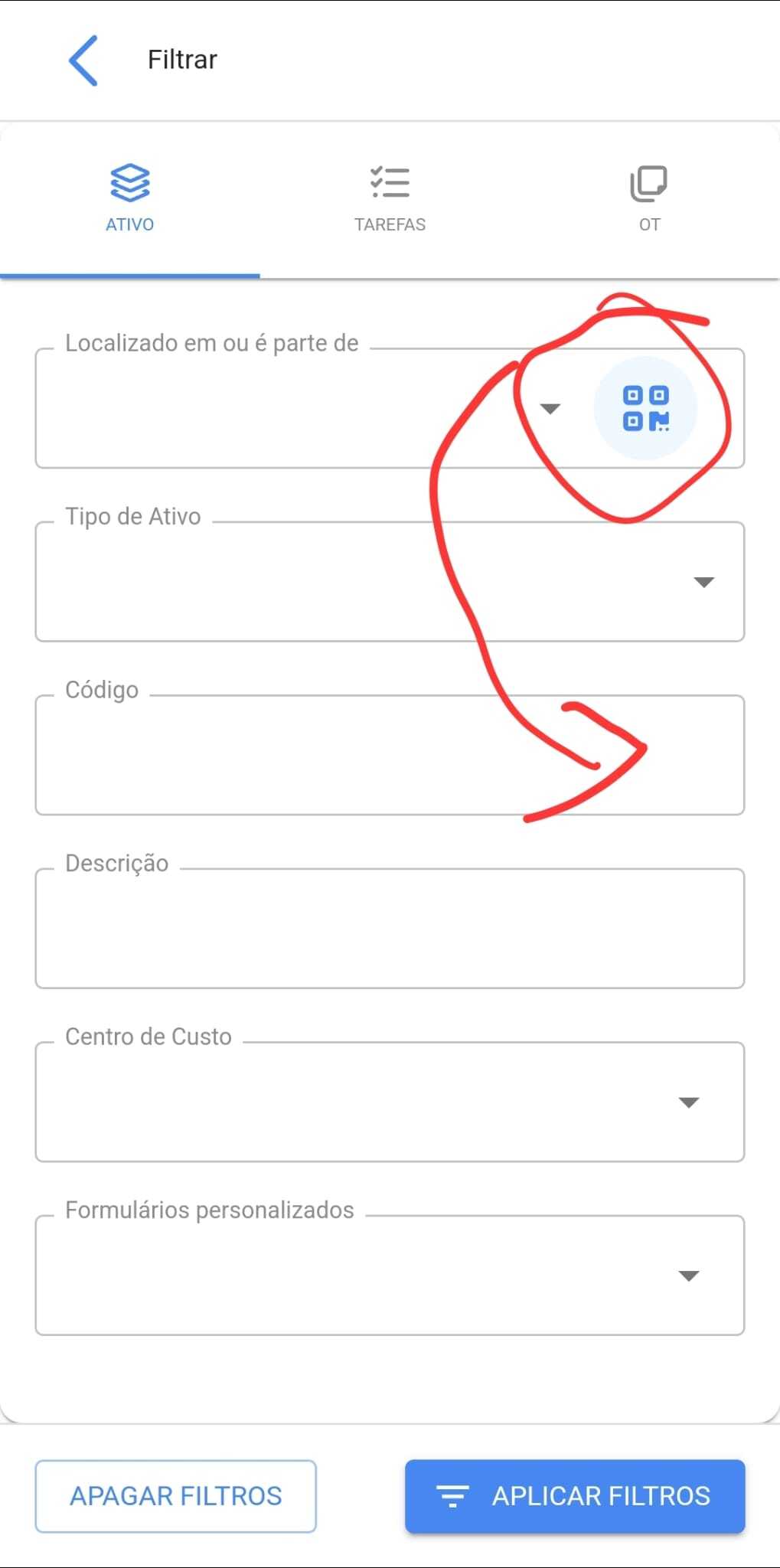 En el módulo Tareas, submódulo Órdenes de Trabajo, en la aplicación móvil, el botón para acceder a la cámara del dispositivo y leer el código QR o código de barras, debe estar asociado al activo que se desea filtrar y no en el campo "Ubicado en o forma parte de ".