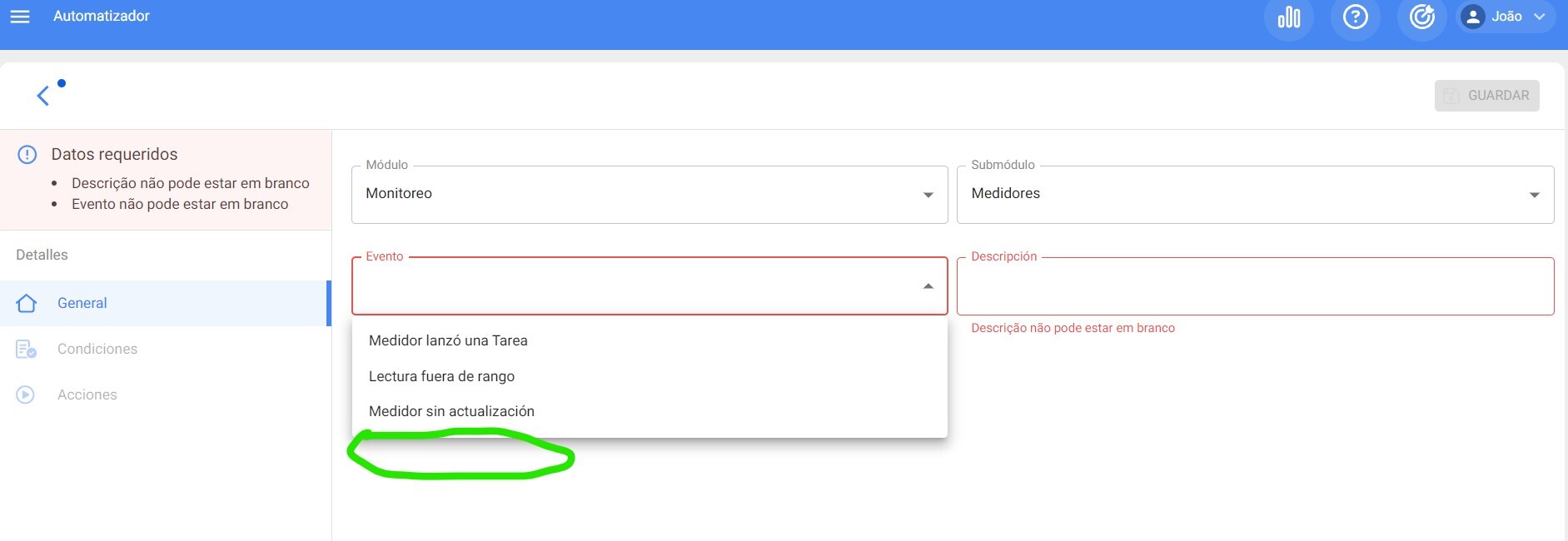 Con el objetivo de replicar la regla de envío de alertas por correo electrónico de tareas pendientes o con atraso, para el evento "n" horas antes del retraso en tareas con activador de calendario en tareas activadas mediante registro de lecturas en medidores incrementales, en el módulo Automator, submódulo de eventos, al crear una regla para el módulo de monitoreo, submódulo de medidores, debe existir un evento, "Lectura de registro previo a la activación de lectura de una tarea".
