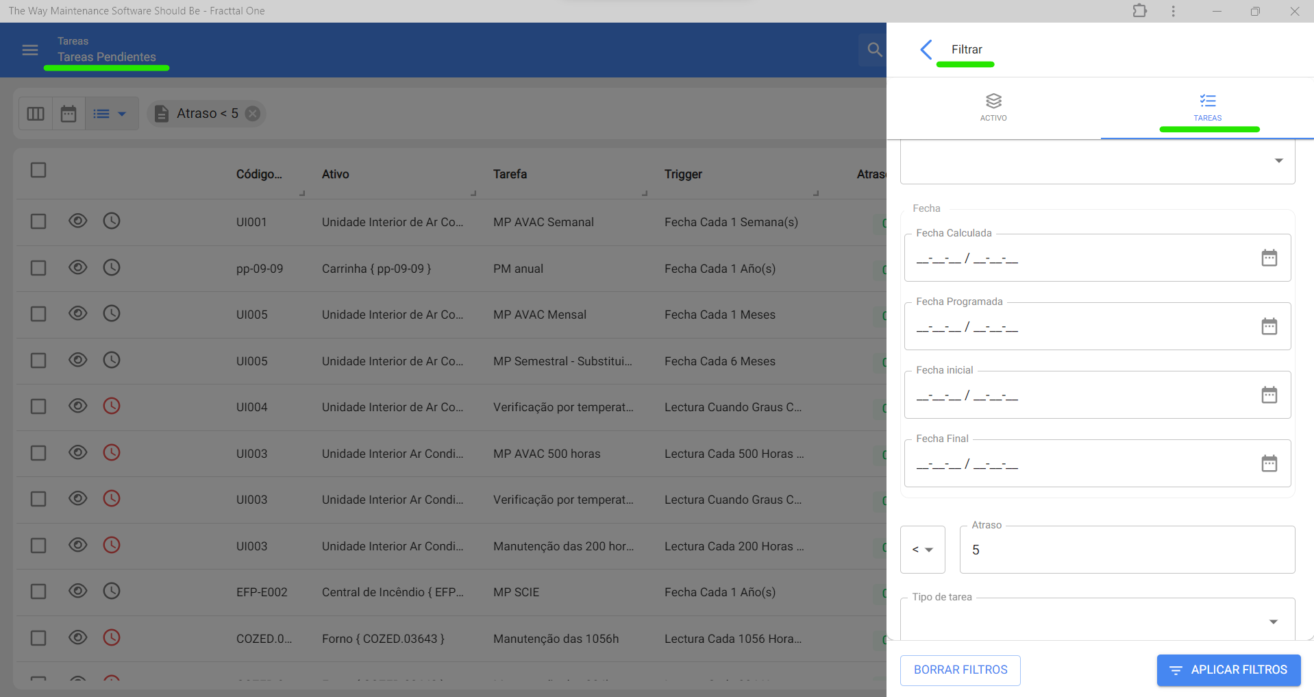 En este momento sólo existe el filtro retraso =, < o > que "n" días, por lo que, cuando pongamos por ejemplo un filtro de retraso < 5 días, aparecerán tareas con un retraso inferior a 5 días, lo que También incluye todas las tareas que aún no están retrasadas, además de las tareas con retraso de menos de 5 días.