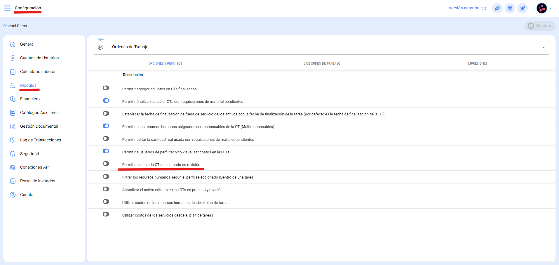 Cordial saludo Patricio, en Fracttal One la opción de firma cuando la orden de trabajo esta en revisión se puede tener por medio de una configuración, la cual, te contamos a continuación para que puedas habilitar