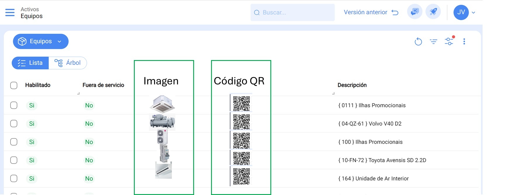 De esta forma, permitiría a los clientes crear catálogos de activos para que los técnicos y operadores puedan identificar más rápidamente el activo deseado, distinguiéndolo de otros activos similares, y finalmente escanear el código QR también disponible en la lista junto a la imagen de cada activo, según el ejemplo adjunto.
