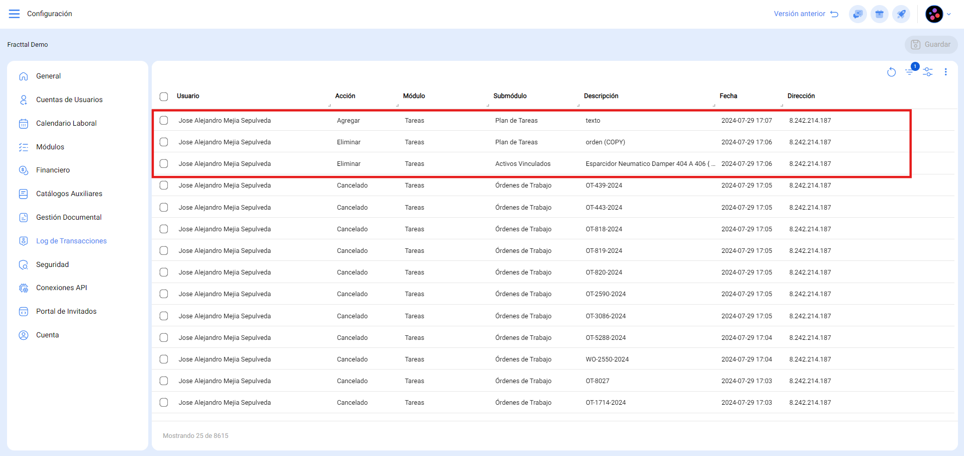 Cordial saludo, Vásquez. Te contamos que en Fracttal One contamos con un módulo para hacer seguimiento a las diferentes acciones realizadas por un usuario en un módulo determinado. Esta información la puedes encontrar en el add-on 'Log de transacciones', ubicado en el módulo Configuración.