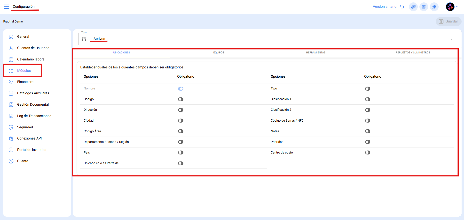 2. Por defecto se abrirá en el tipo de módulo el de "Activos". Allí solo resta ingresar a cada tipo de activo y según la necesidad marcar que campos se desean poner como obligatorios, como se muestra en la figura siguiente: