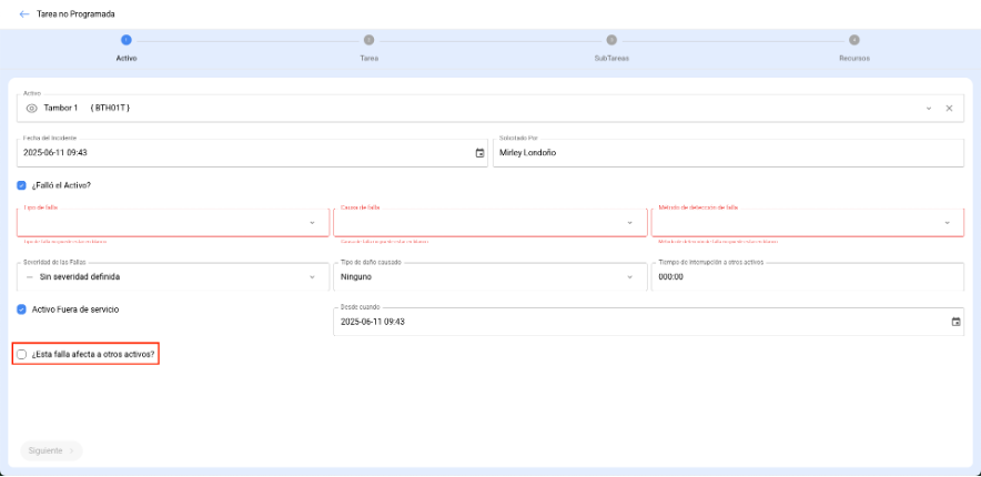 Como resultado de este proceso, tanto el activo que presentó la falla como los activos seleccionados compartirán el mismo registro de fuera de servicio en su historial, asegurando coherencia en la trazabilidad del evento.