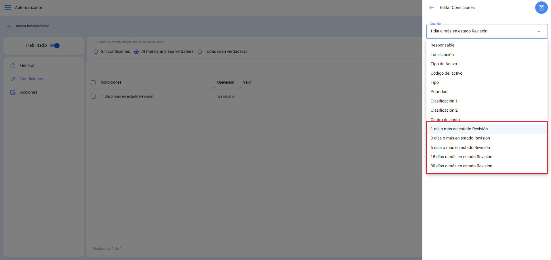 Cordial saludo Andrea. Te contamos que en la ultima versión de Fracttal One, se ha liberado esta regla. Ahora, en el evento de Orden de Trabajo en Revisión, se han agregado las condiciones de tiempo para que de esta manera se pueda seleccionar la acción de que se envié automáticamente las OTs al estado Finalizadas.