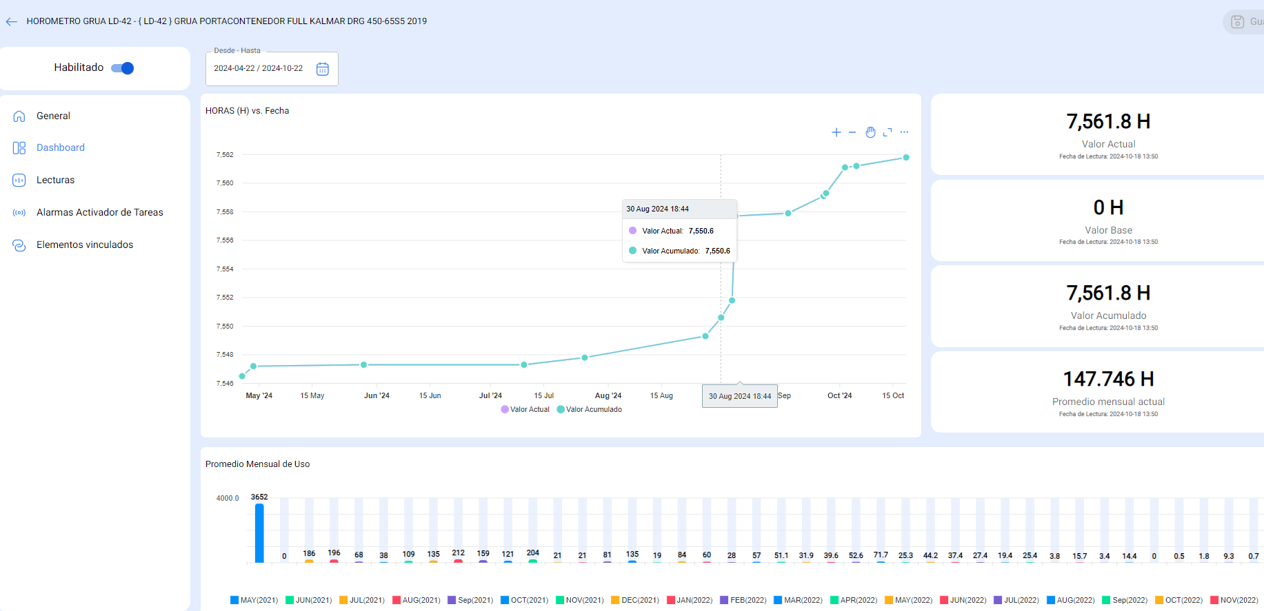 Al seleccionar un ciclo de tiempo determinado, el dashboard toma en cuenta el total de registros históricos (horas de uso del equipo) del medidor del equipo.