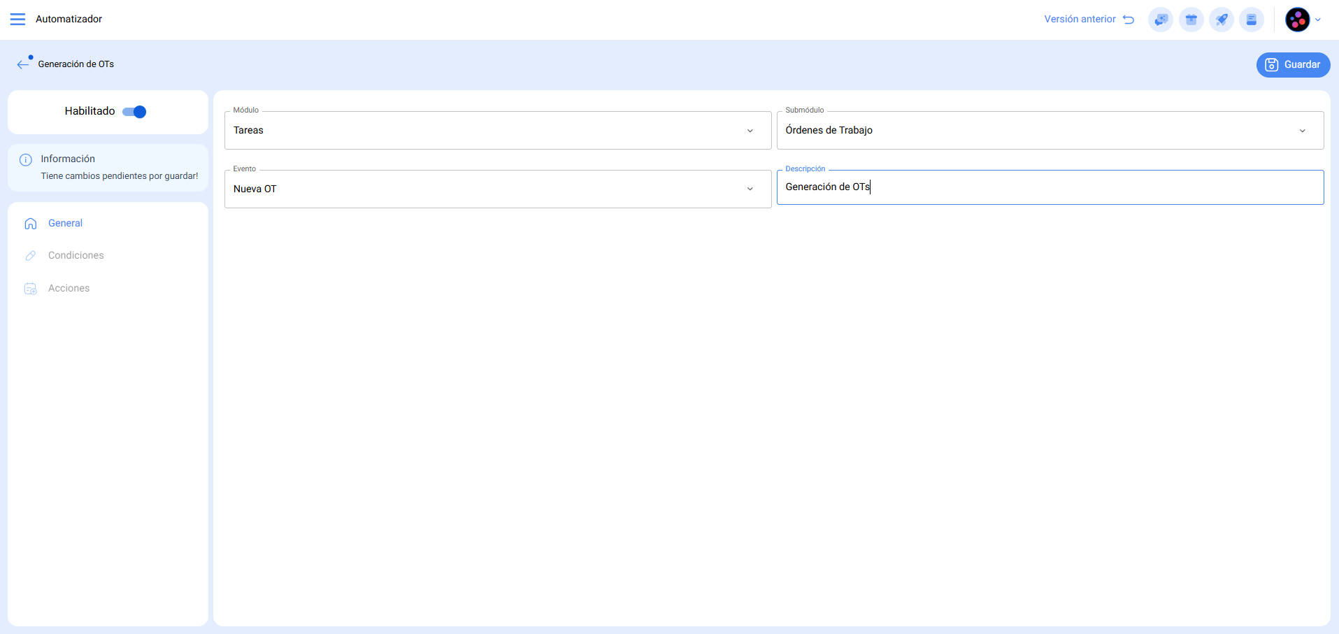 1. Ingresar al módulo automatizador y crear una nueva regla para el módulo "Tareas", submódulo "Tareas Pendientes" y evento "Tareas pendientes o con atraso"