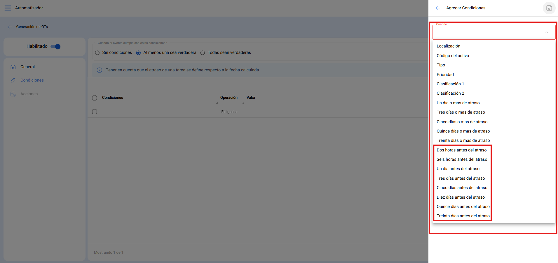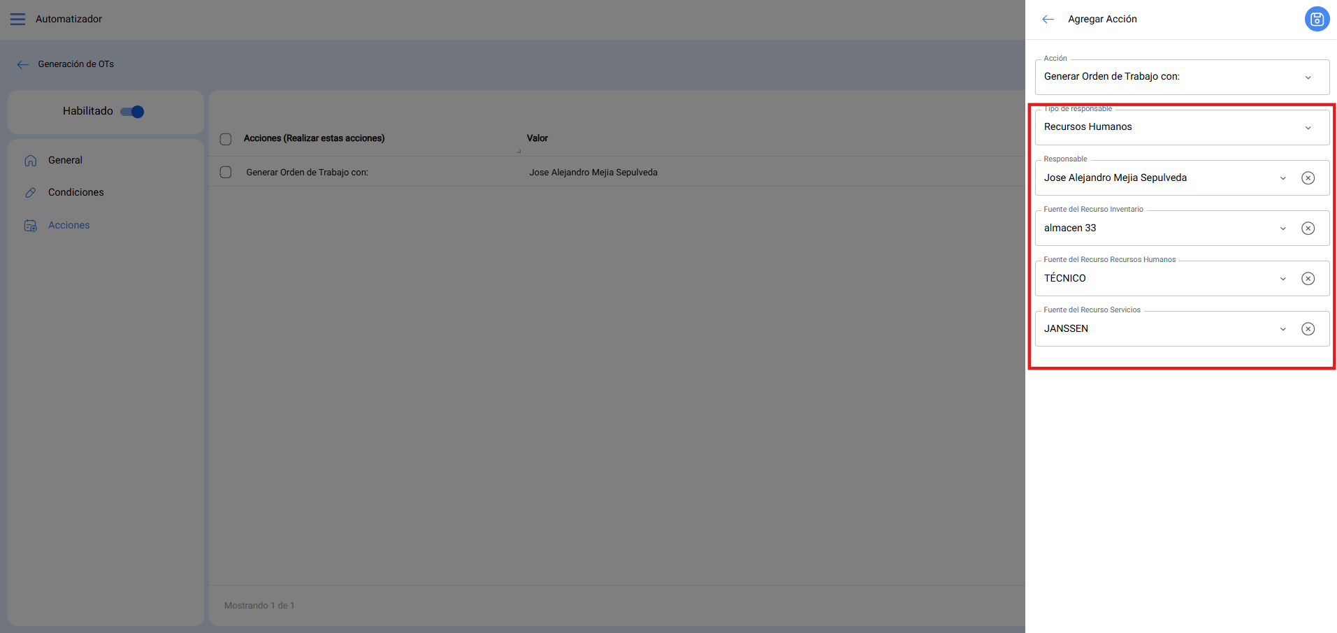 2. Ingresar las condiciones para que las generación se pueda crear específicamente a la persona deseada y debe incluir el tiempo con el que se desea que se genere la OT, teniendo como mínimo 2 horas antes de que se cumpla la hora de ejecución de la tarea