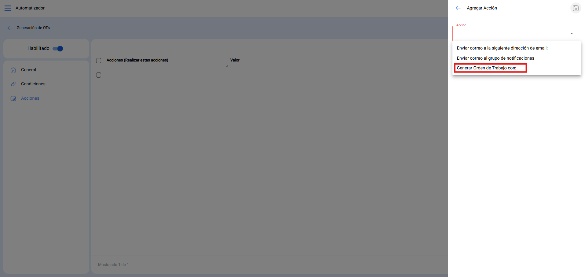 3. Por ultimo, seleccionar la acción de generar OT automaticamente