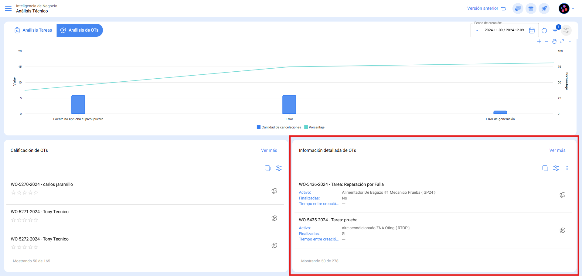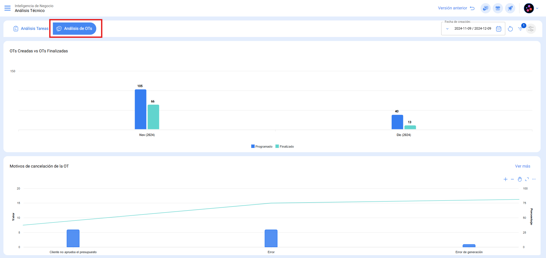 1. Ingresar al módulo Inteligencia de Negocios y pasar a la pestaña Análisis de OTs
