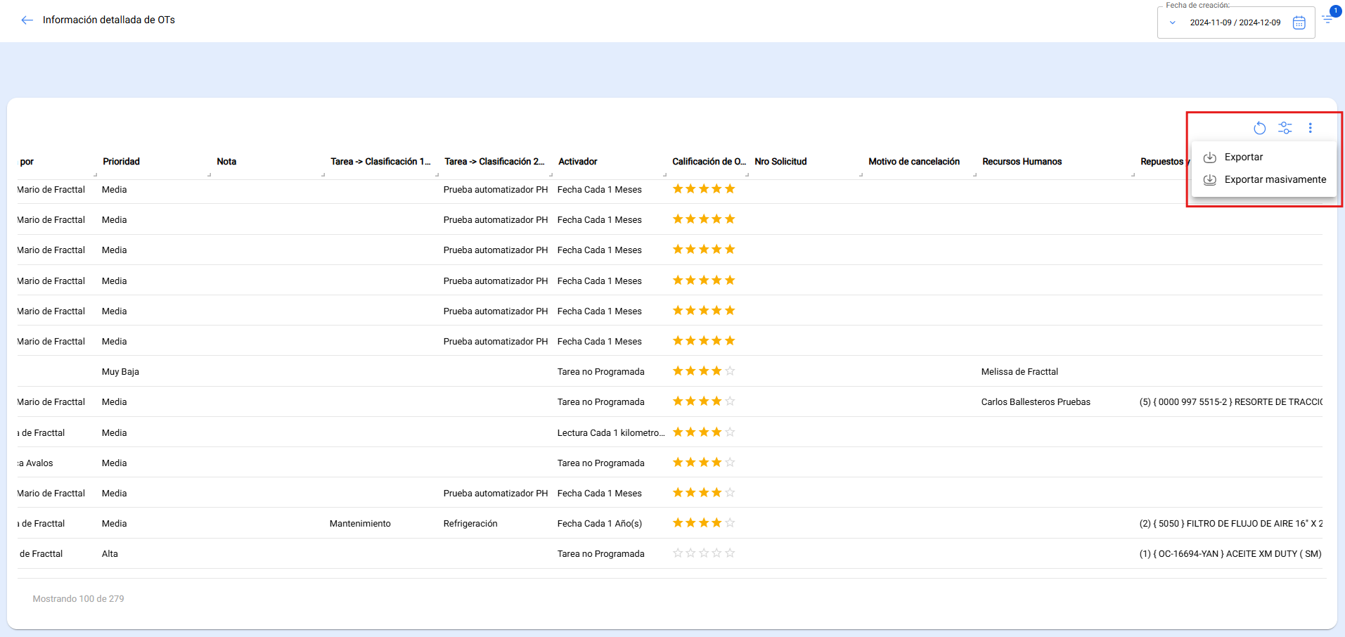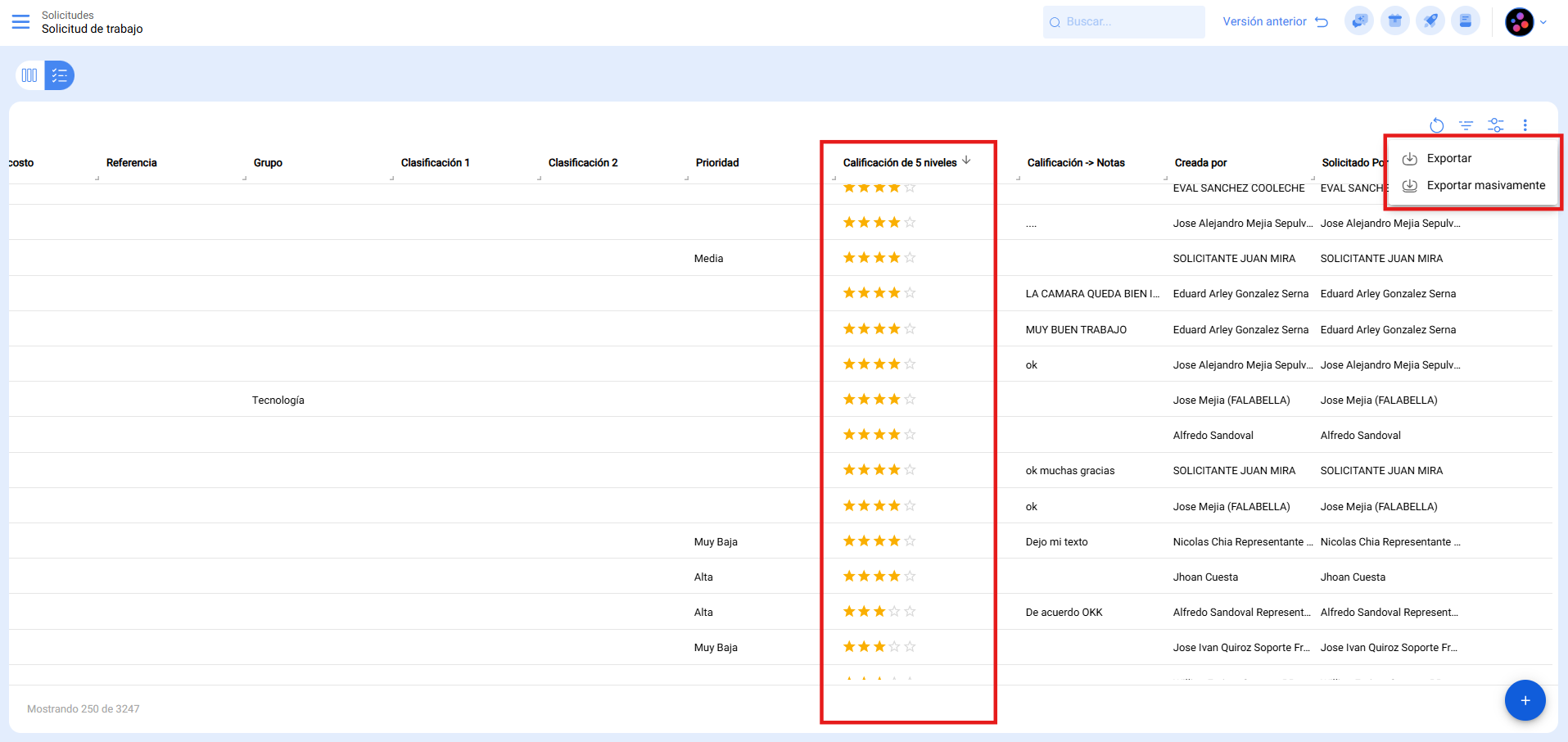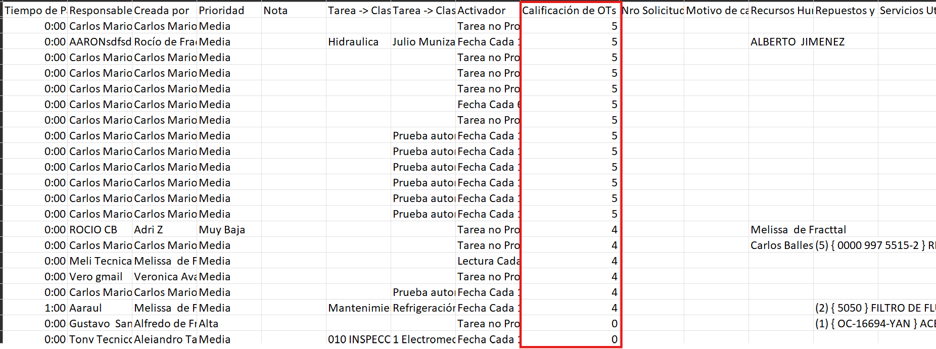 2. En la vista lista se puede exportar la información, donde se cuenta con la calificación tal como en la ordenes de trabajo