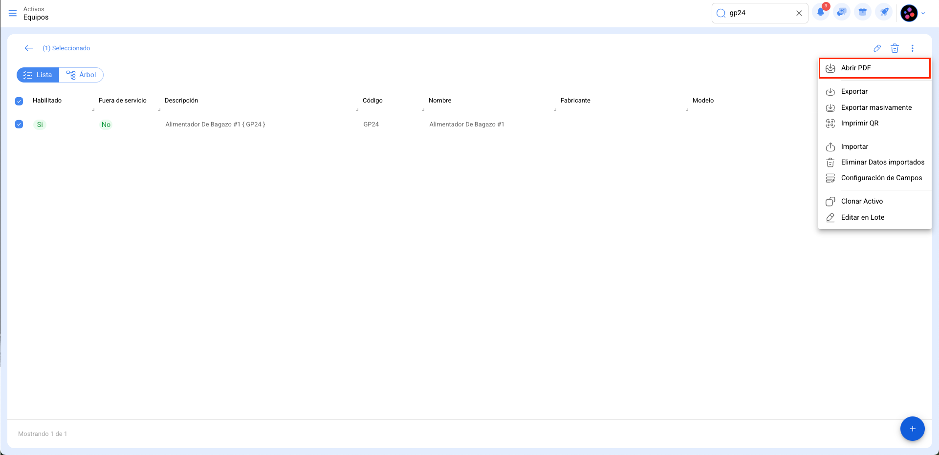 Actualmente Fracttal permite realizar dicha acción. Desde el módulo Activos puedes seleccionar el activo y en la opciones le das en Abrir PDF como se muestra, a continuación: