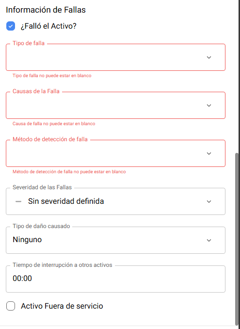 Es necesario que al momento de habilitar el tiempo fuera de servicio de una orden de trabajo también se debe agregar un campo con tiempo de interrupción de otros activos, pero el campo que permita traer los nombres de todos los activos, y así poder escoger el equipo relacionado o equipo que nosotros queramos relacionar.