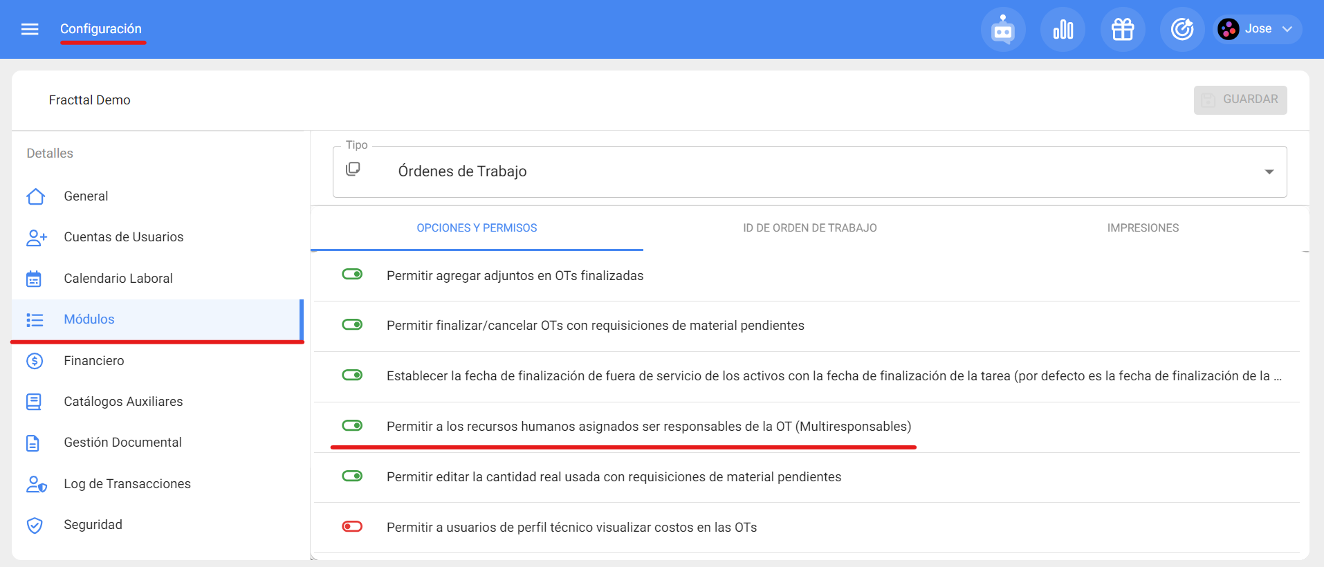 Cordial saludo Andrés, te contamos que en Fracttal One se ha implementado la nueva opción de multirresponsable, donde ahora al momento de tener habilitada la opción que se detalla en la Figura 1, todas los usuarios que registres como recurso humano dentro de alguna de las tareas de una orden de trabajo, podrán interactuar y ejecutar las tareas tal cual las puede realizar el responsable de la orden de trabajo.