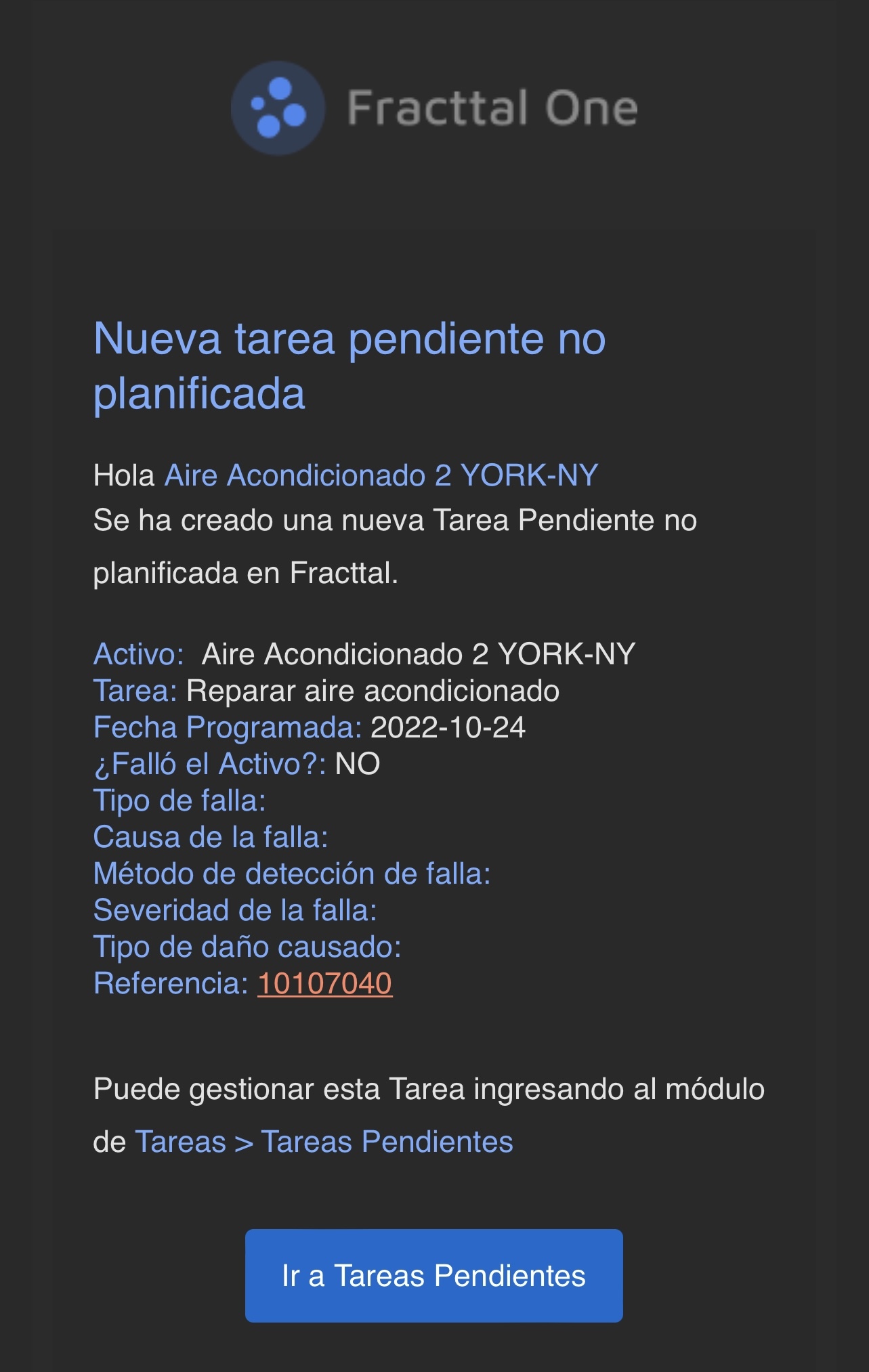 Cordial saludo Esteban, Actualmente la notificación contiene la información que se ingresa al crear la tarea no planificada como lo es el tipo de daño causado, severidad de la falla, método de deteccion de la falla, causa de la falla y tipo de falla.