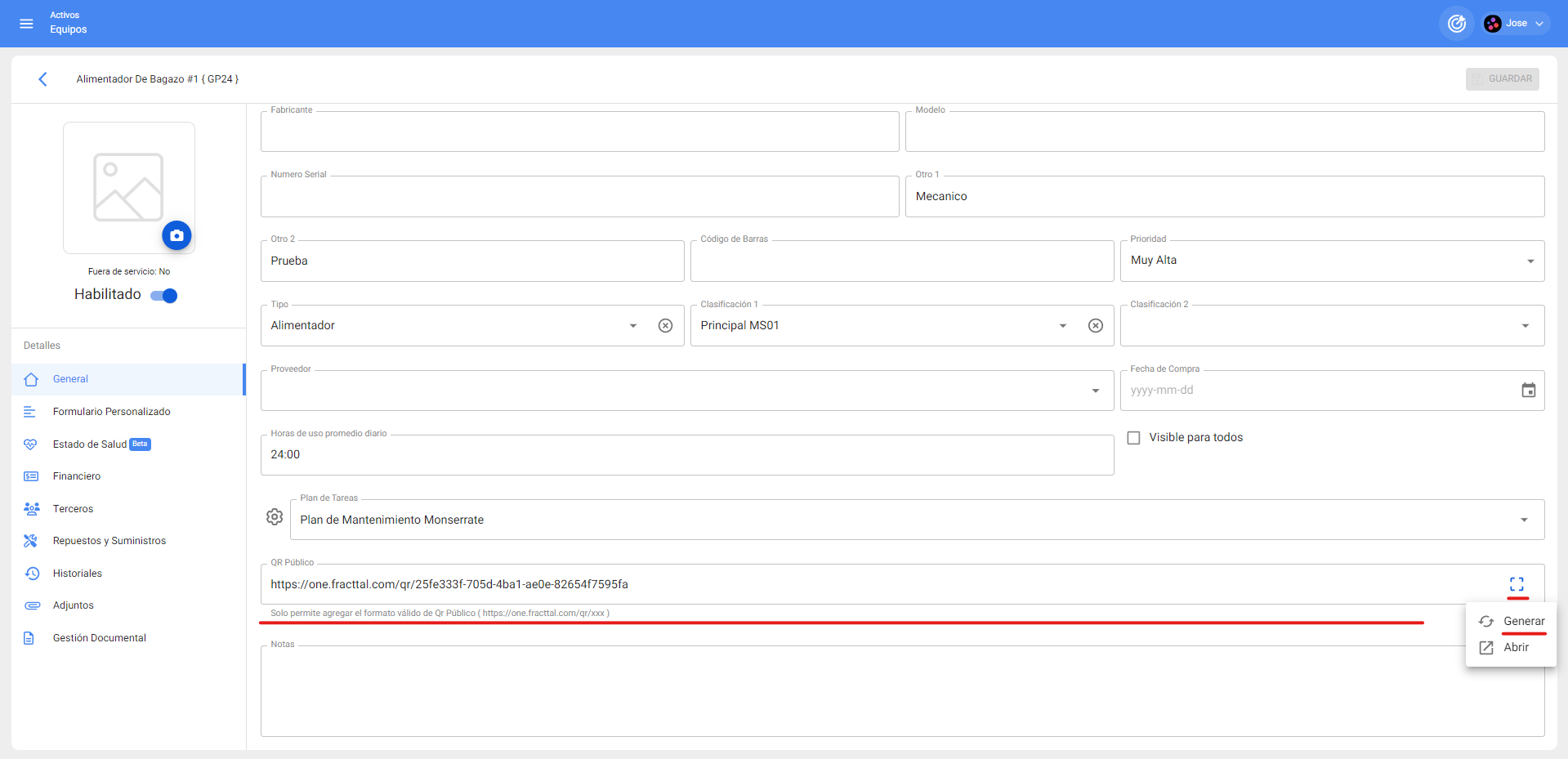 Cordial saludo, te contamos que Fracttal One tiene disponible esta funcionalidad conocida como QR publico, de manera que al generar el ULR podrás crear el QR con el que cualquier persona al leerlo con su dispositivo podrá consultar la información básica del activo asociado, esto sin la necesidad de ingresar directamente a la plataforma, a continuación te compartimos el procedimiento para que puedas aprovechar al máximo esta opción