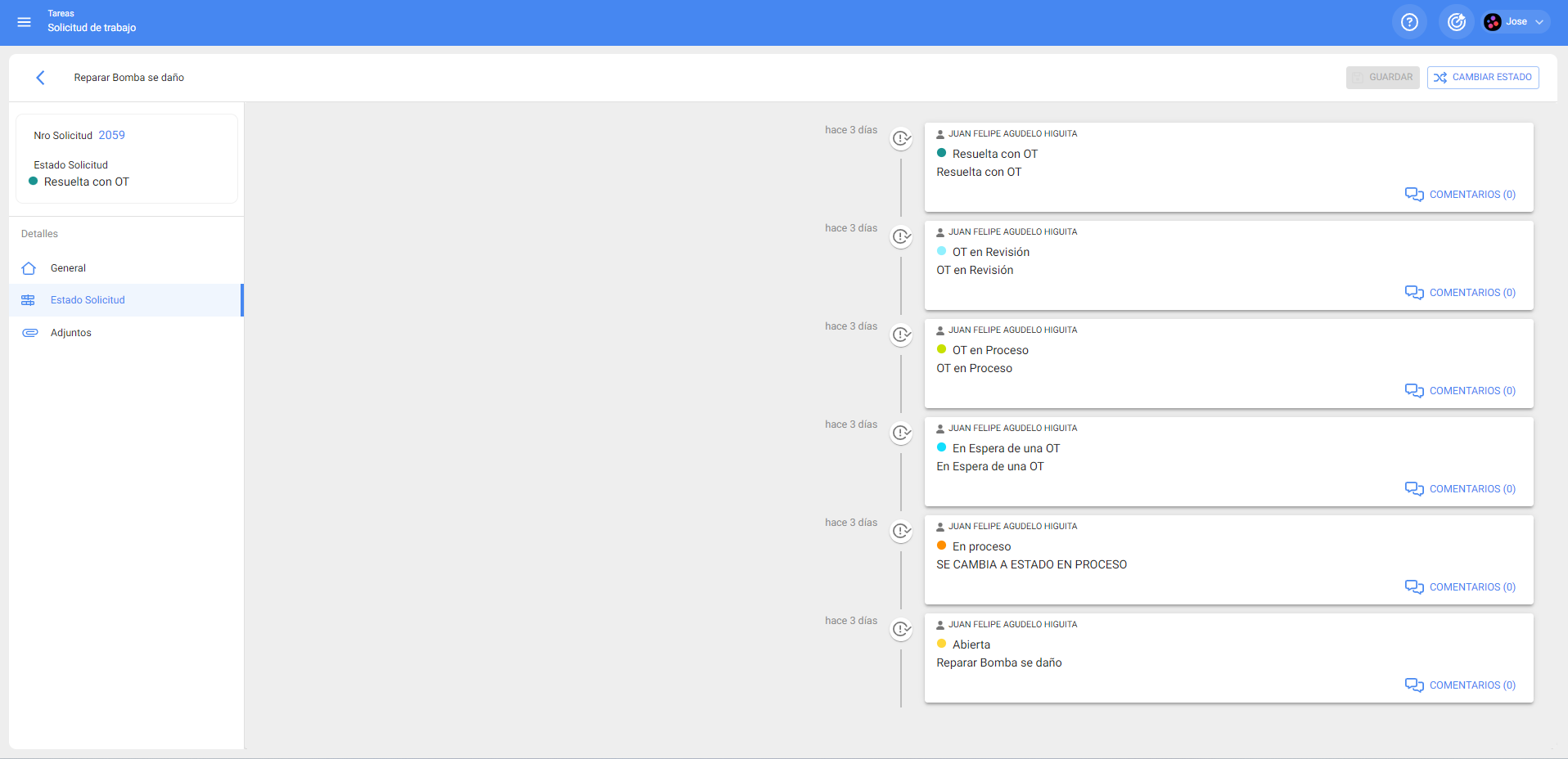 SOLICITUDES DE TRABAJO: POR MI PARTE RECIBO LAS SOLICITUDES DE OTROS DEPARTAMENTOS. UNA VEZ QUE LLEGAN YO SE LOS ENTREGO A DIFERENTES TECNICOS, PERO PARA PODER ASIGNAR A DIFERENTES TECNICOS DEBO CONVERTIR LA SOLICITUD DE TRABAJO EN UNA OT, PUDIENDO SALTARME ESTE PASO CON EL SOLO HECHO DE QUE AL MOMENTO DE RECIBIR LA SOLICITUD, PODERLA ASIGNAR, O PODER COMPARTIR TANTO POR LINK O FORMATO A TRAVES DE CORREO. SIMPLIFICARIA BASTANTE LA GESTION DE UN DEPARTAMENTO