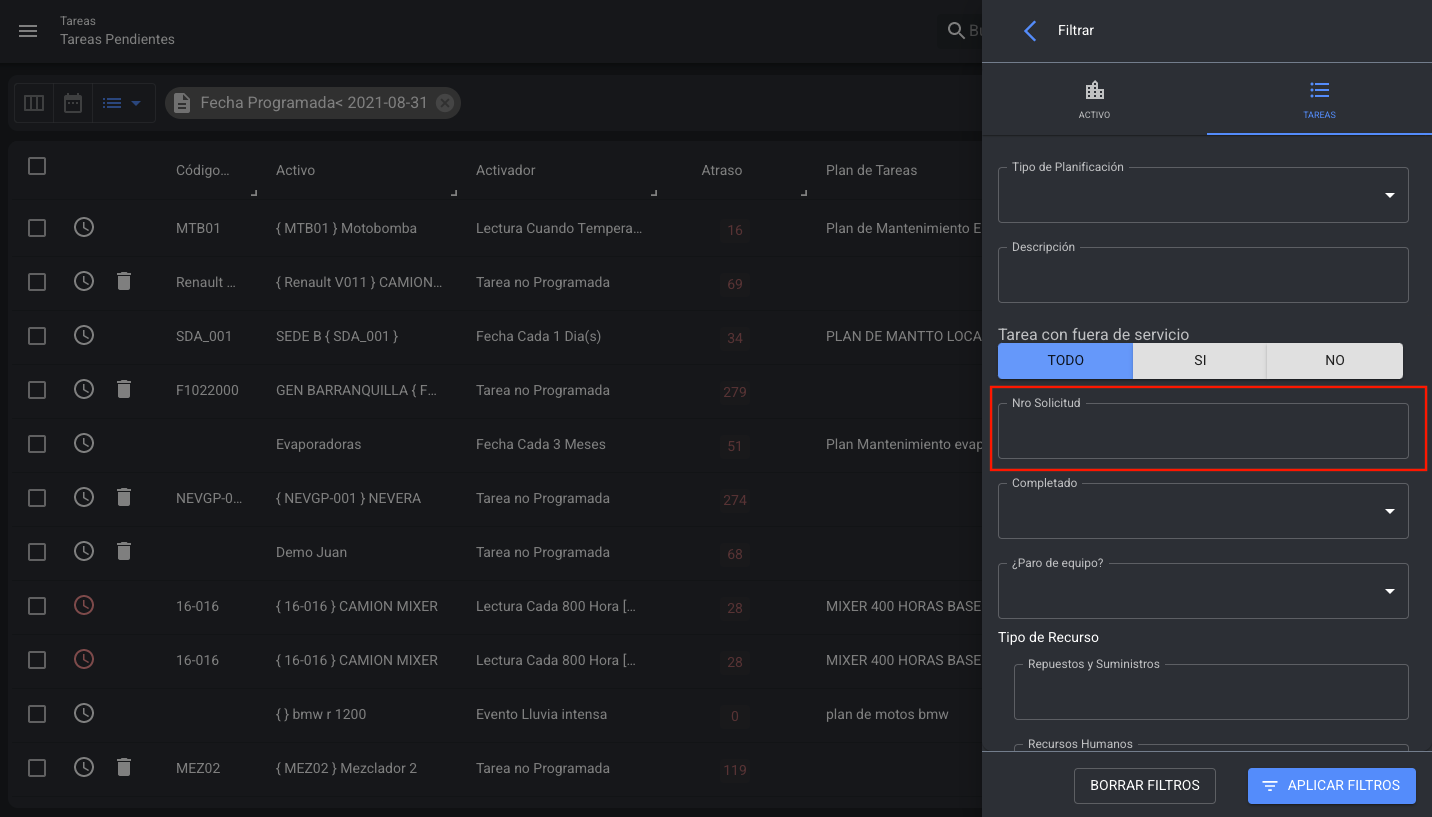 Hola! actualmente en el módulo de tareas se encuentra habilitado la opción de filtrado por Nro de solicitud.