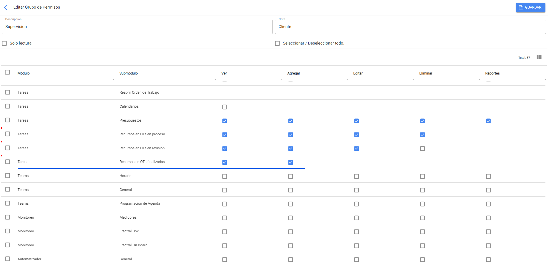 3. Seleccionar el grupo de permisos al que se le concederá la opción de poder agregar recursos cuando la OT se encuentra finalizada como se ilustra en la siguiente imagen