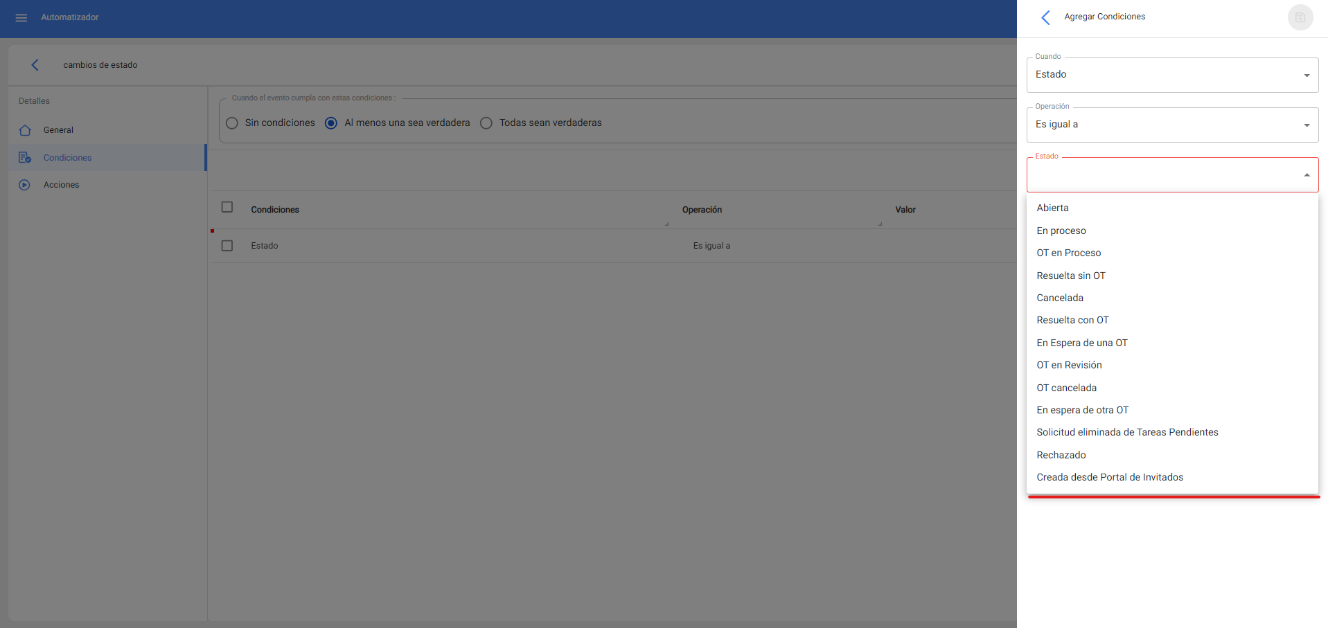 El automatizador como evento tiene la opción de enviar un correo cuando una solicitud cambia, pero en las condiciones no se puede seleccionar si este estado tiene un valor particular.