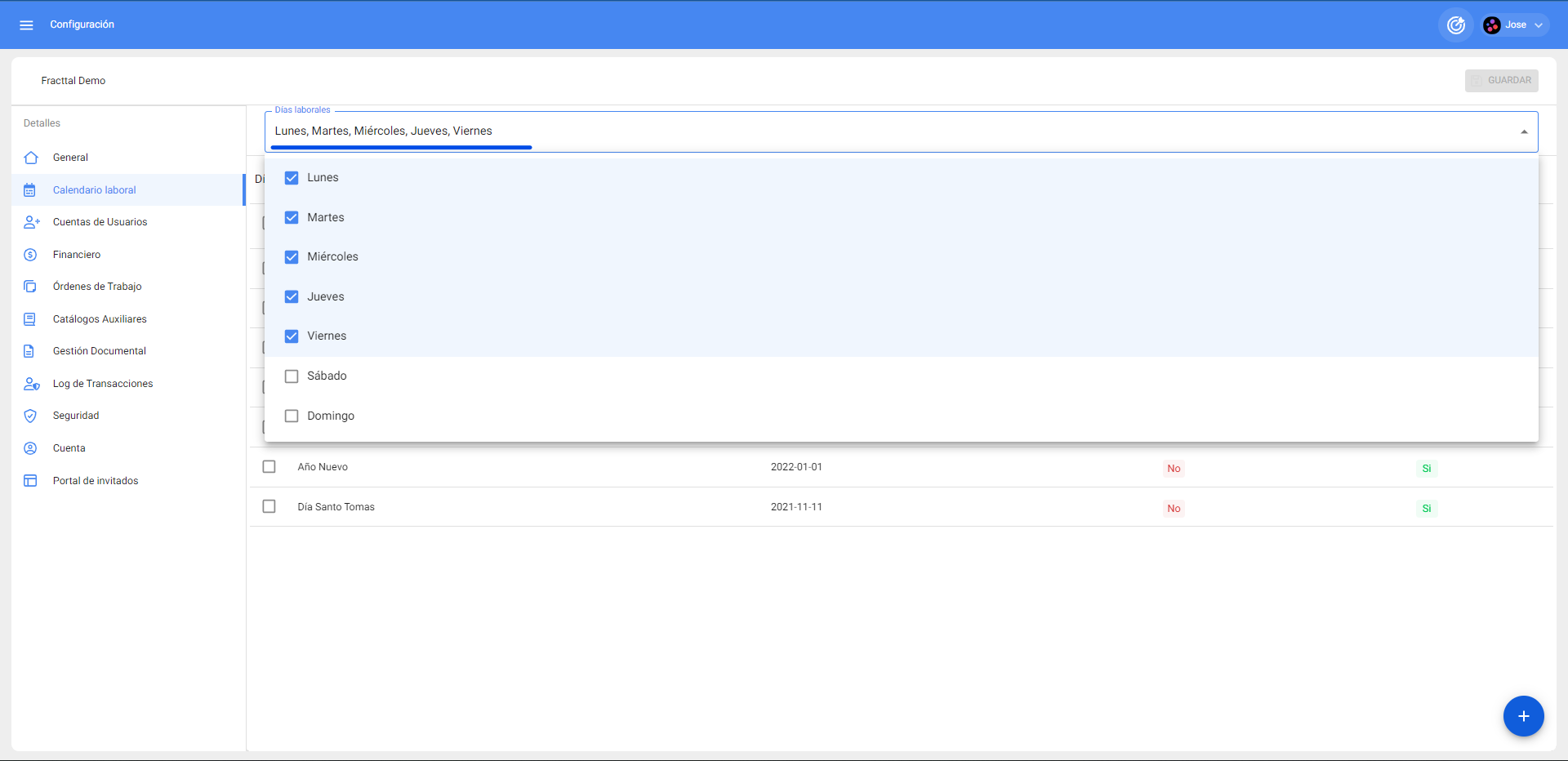2. Seleccionar los días hábiles en los que se podrán realizar actividades y agregar los días feriados.