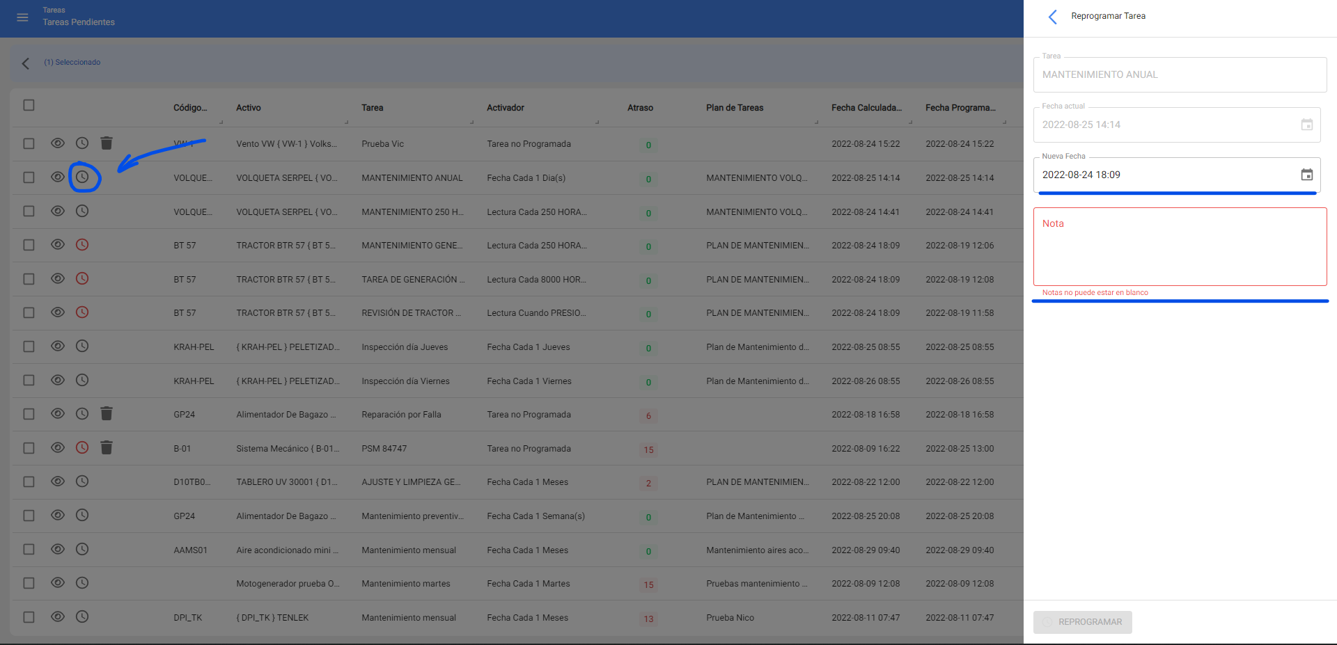2. Buscar la tarea a reprogramar y dar clic en el icono de reloj