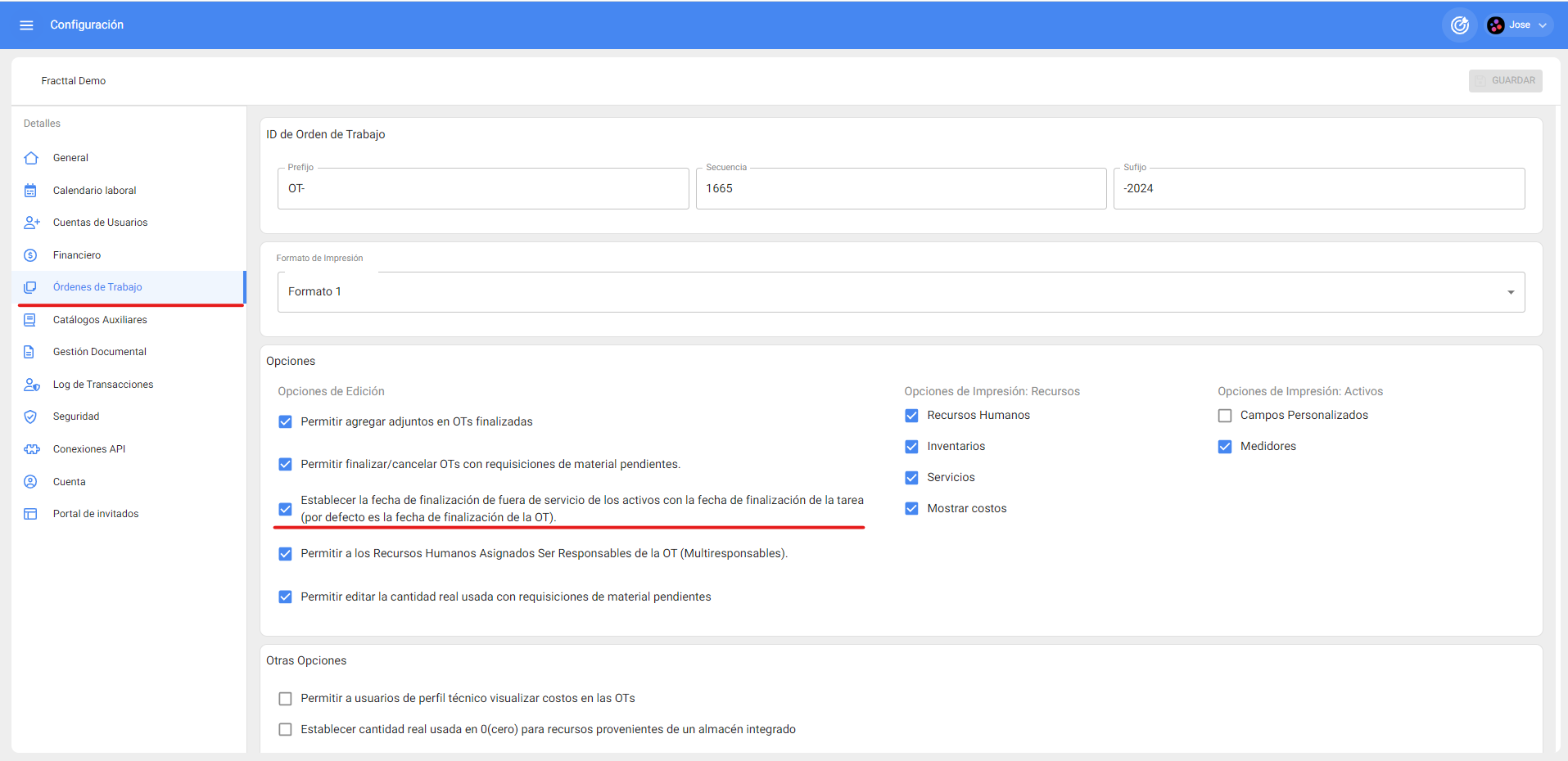 2. Ingresar al submódulo Órdenes de Trabajo y activar la casilla "Establecer la fecha de finalización de fuera de servicio de los activos con la fecha de finalización de la tarea (por defecto es la fecha de finalización de la OT"