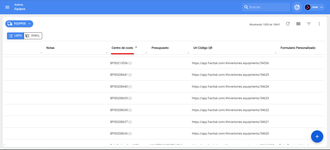 Cordial saludo, te contamos que tu sugerencia se encuentra disponible en Fracttal One, donde por cada equipo podrás ingresar el centro de costos al que pertenece, como también el presupuesto, así, al ingresar a la tabla de los equipos podrásevidenciar las respectivas columnas como te ilustramos a continuación: