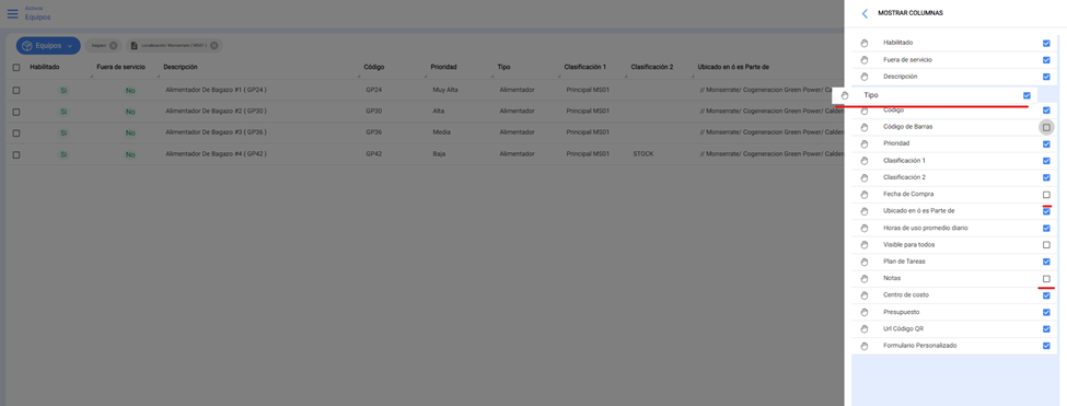 • En la opción de Mostrar Columnas, permite agregar/quitar columnas y de igual manera se puede seleccionar cada columna y cambiar su posición.
