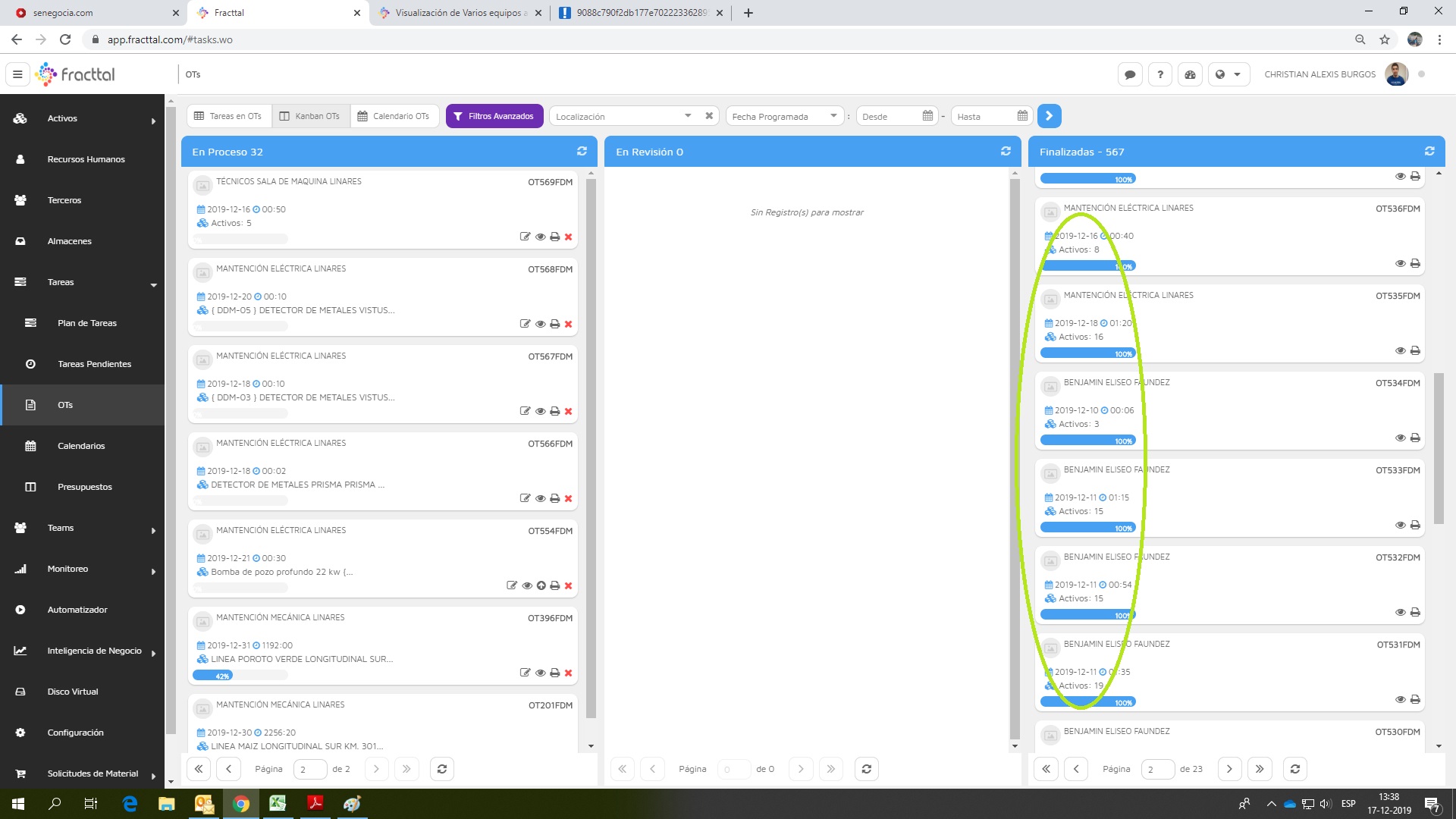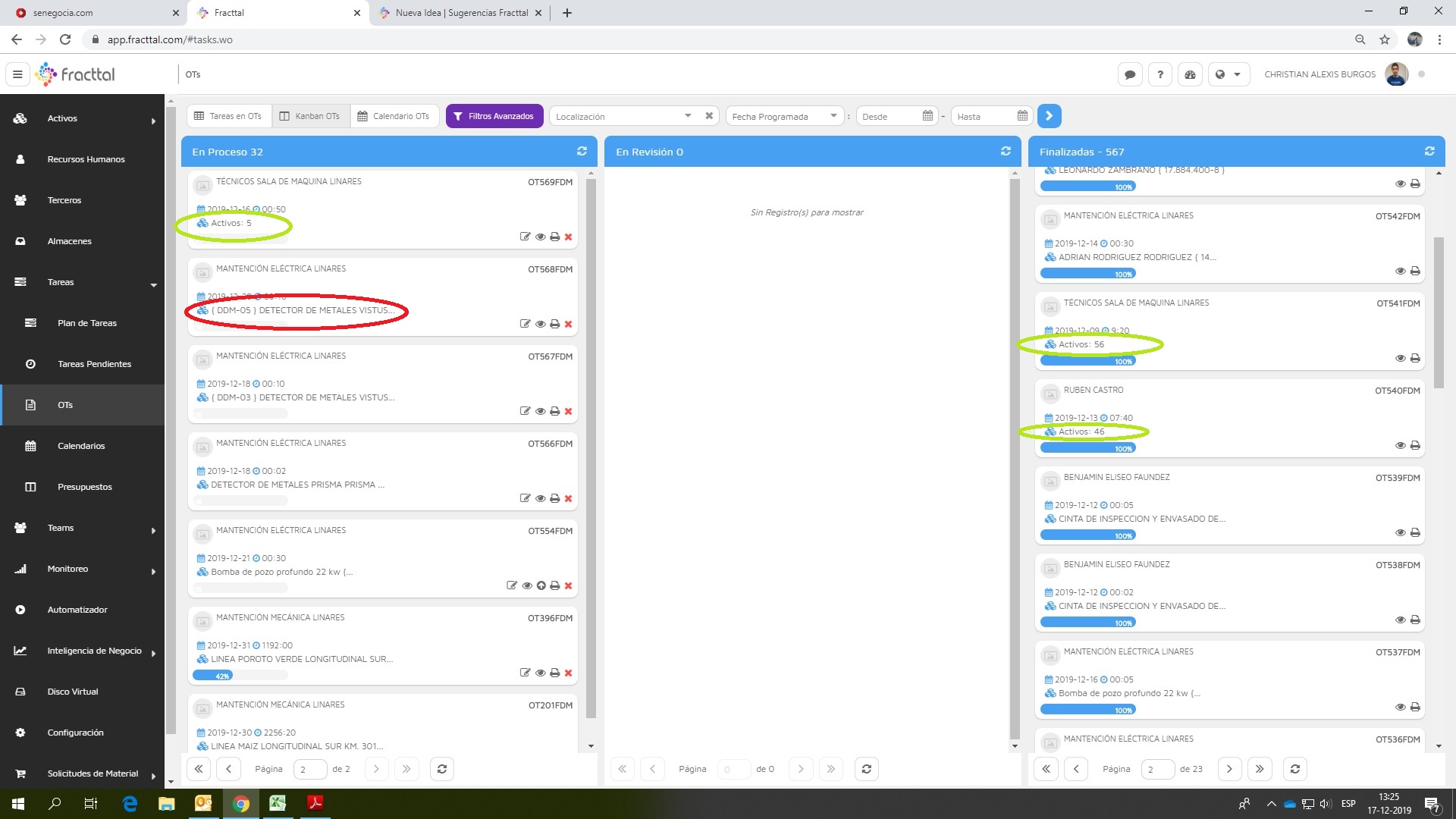 Inicialmente cuando uno asigna 1 equipo o tarea a una sola OT, visualmente en la OT en proceso/revisión/finalizado  se visualiza el técnico asignado y el equipo, por otra parte cuando genero varios equipos a una sola OT en esta visualización solo aparece asignado como X equipos, seria bueno mejorar esto ya que tiende a confundir a los técnicos ya que no saben a que OT pertenece tal equipo, quizás como idea debiera salir el 1 equipos y mas X equipos. dejo adjunta una imagen en referencia donde color verde es como salen asignados los equipos, y en rojo como debiera salir visto.